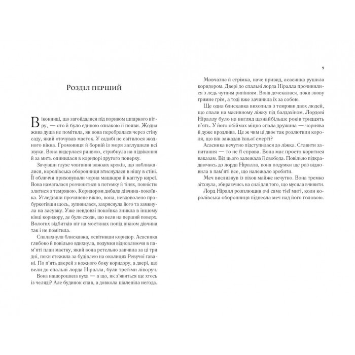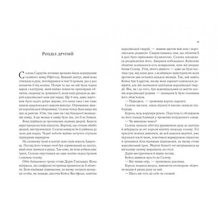 Найбезстрашнішій з усіх асасинок Адарлену лише вісімнадцять. Селена — видатна вбивця, якій вдалося виграти небезпечні змагання та здобути титул королівської оборонниці. Утім, їй обіцяли ще й таку омріяну свободу, а натомість дівчина не здатна навіть дати волю своєму серцю.